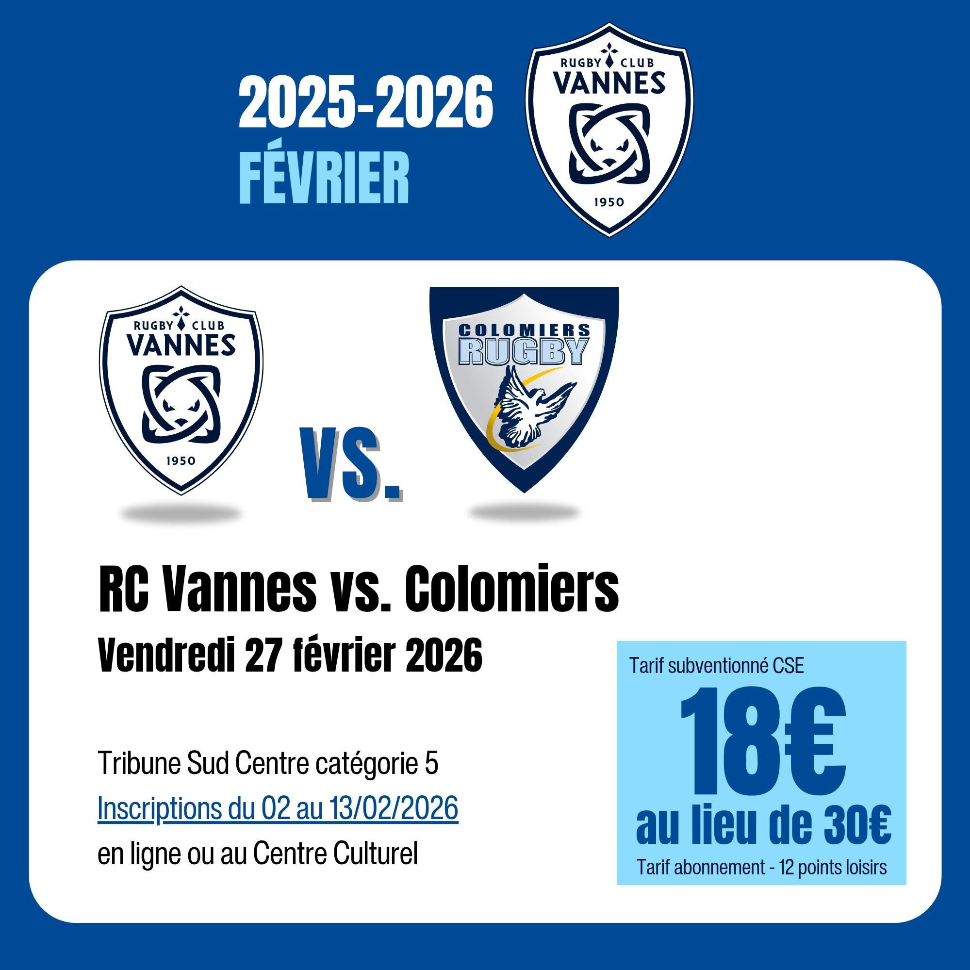 L'équipe du RC Vannes affrontera l'équipe de Colomiers le vendredi 27 février 2026 sur la pelouse de La Rabine.